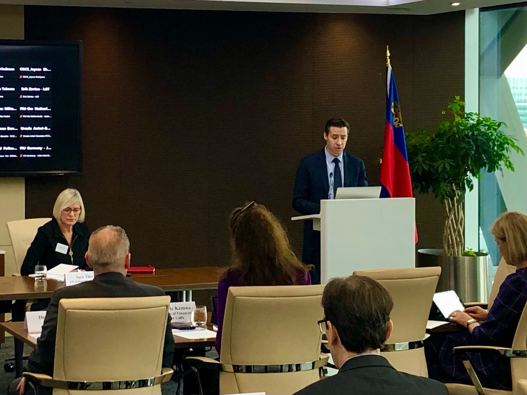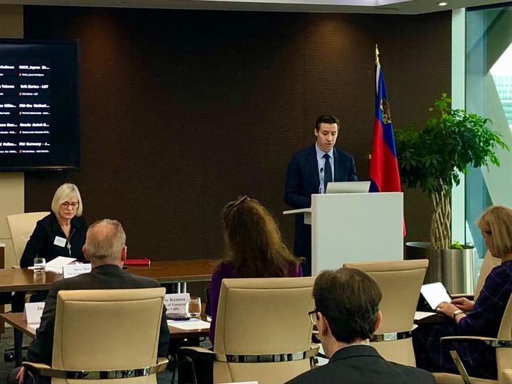 OSCE Special Representative and Co-ordinator for Combating Trafficking in Human Beings Valiant Richey speaking at the roundtable discussion on Trafficking in Human Beings, Slavery and the Financial Sector, London 29 November 2021 (Jessica Roberts/IASC)