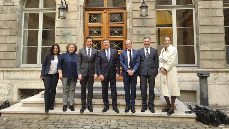 (L,r) OSCE Country Visit Officer Tarana Baghirova, OSCE Senior Co-ordination Adviser Tetiana Rudenko, OSCE Special Representative and Co-ordinator for Combating Trafficking in Human Beings Valiant Richey, President of the State Council of Geneva Mauro Poggia, Cantonal Representatives Redouane Saadi and Laurent Knubel, and Swiss Federal Department of Foreign Affairs Representative Jana Röthlisberger after their meeting in Geneva, 19 October 2022.