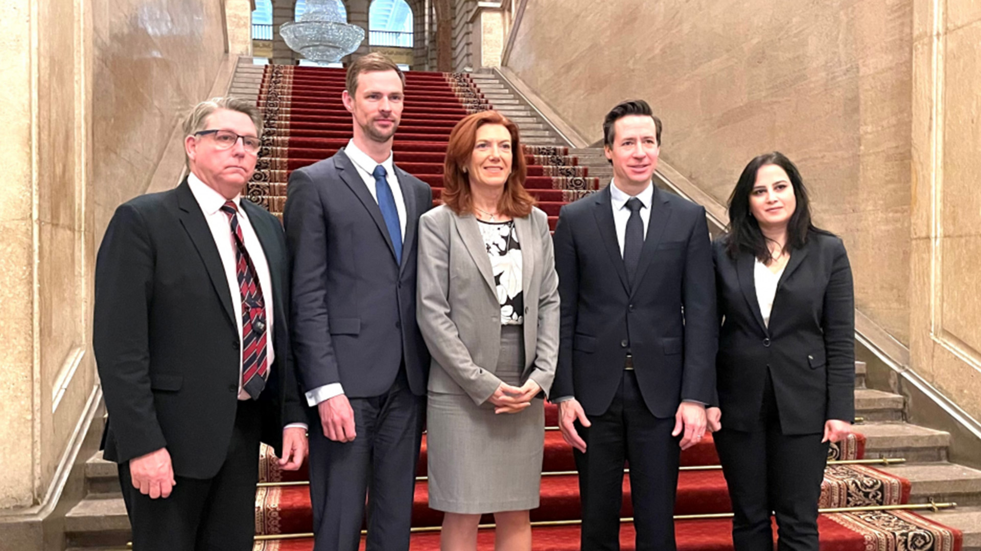 (l-r) Members of the Council Europe's delegation - Kevin Hyland, Consultant for the Council of Europe; Yuryi Paltsev, Administrator in GRETA's Secretariat; Petya Nestorova, Executive Secretary to the Council of Europe Group of Experts on Action against Trafficking in Human Beings (GRETA); members of the OSCE delegation - Valiant Richey, Special Representative and Co-ordinator for Combating Trafficking in Human Beings; Tarana Baghirova, Country Visit Officer, Sofia, 31 January 2023.