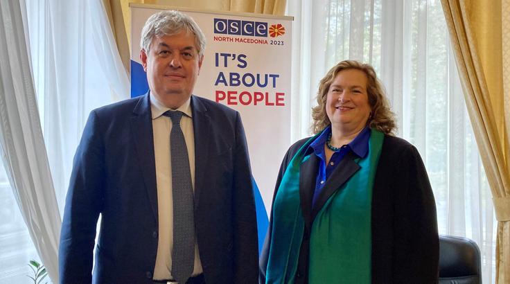 Ambassador Igor Djundev, Permanent Representative of North Macedonia to the OSCE, meeting the newly appointed OSCE Special Representative and Co-ordinator for Combating Trafficking in Human Beings, Dr. Kari Johnstone, Vienna 30 October 2023